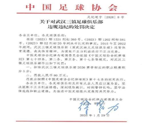 在昨日足协公布的罚单中,武汉三镇于2015年至2022年期间,违背体育道德、丧失体育精神、为谋取不当利益进行不当交易,因此被扣除2026赛季中超联赛积分5分并罚款80万元。他们也是被扣分最少的中超球队之一。